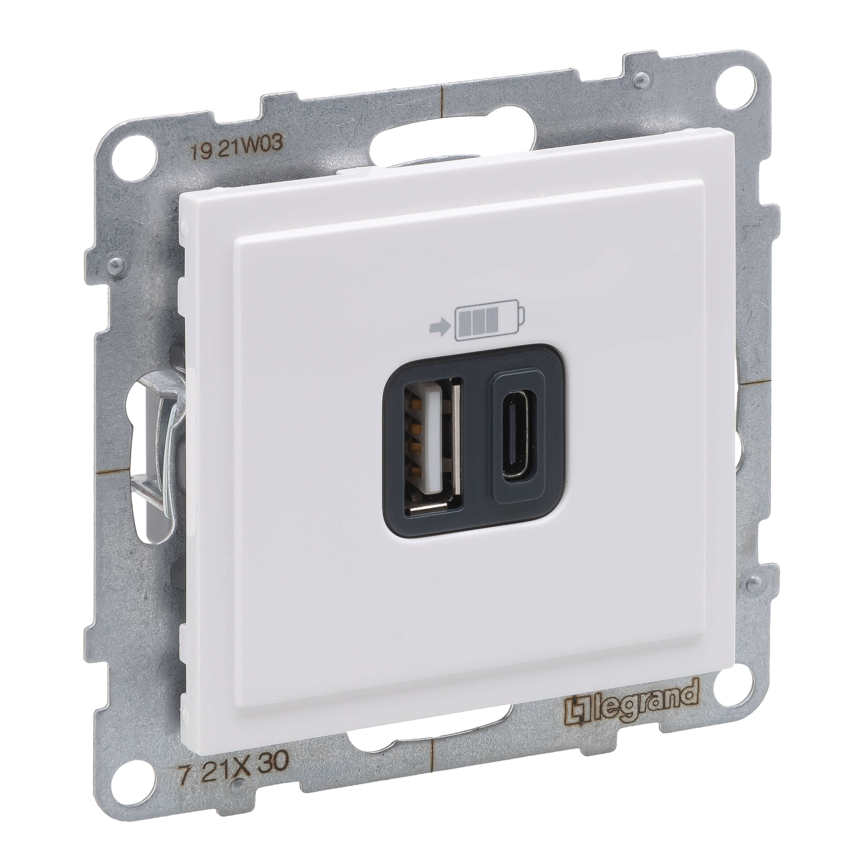 Tomada dupla USB: 1 Tipo-A + 1 Tipo-C, Branco